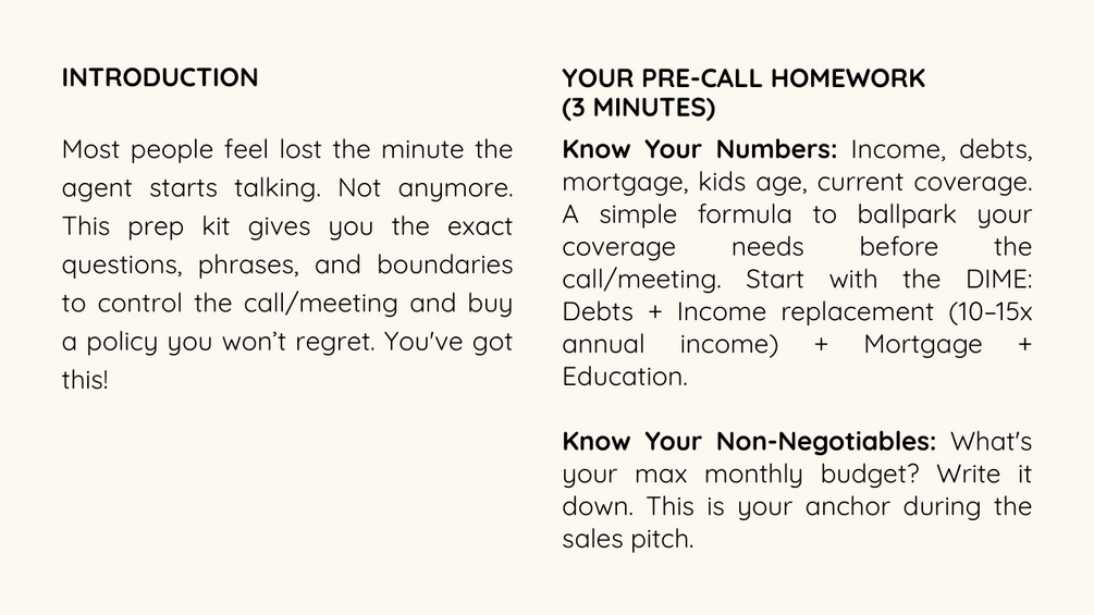 Talking to agents shouldn’t feel like a test. This kit gives you the exact words and questions to run a focused 15-minute call, compare apples-to-apples quotes, and avoid pushy upsells. You’ll open with a boundary-setting script, work through a proven question checklist (with “why ask” and “listen for” cues), and close the call with a clear request for written illustrations. Result: you protect your family and your wallet like a pro.